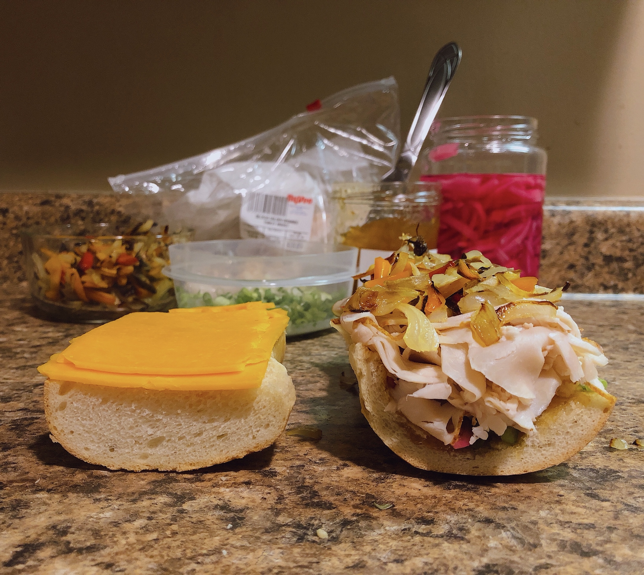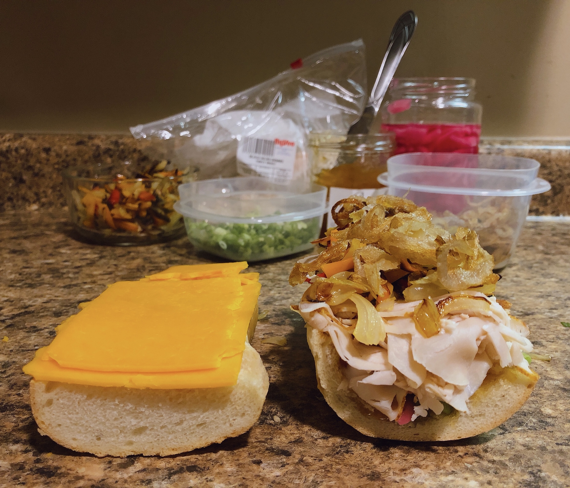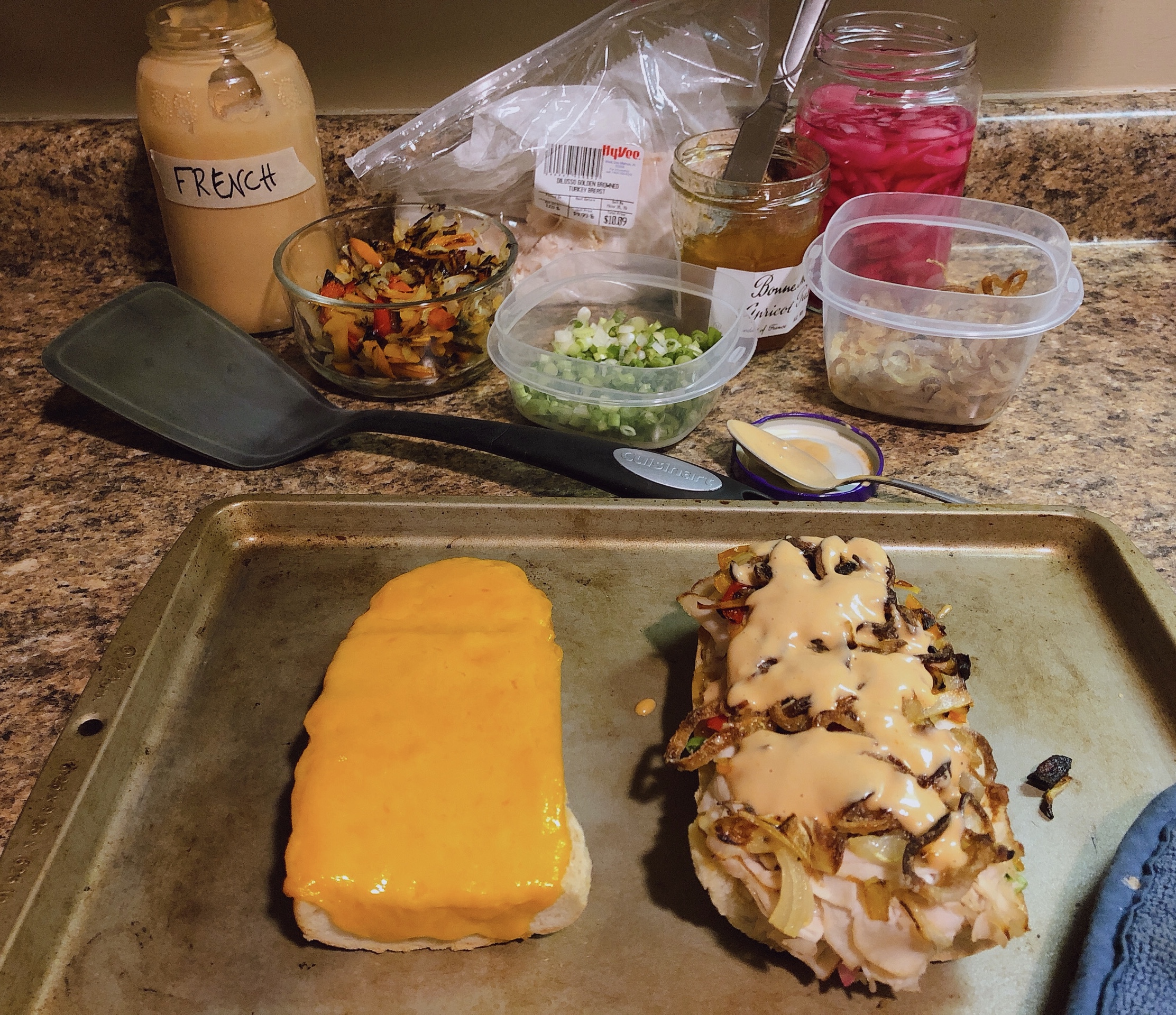 - Assembly, part one: 1) Sprinkle on the scallions, pressing them into the preserves; make sure to get them on the “walls” of the bread (if you scooped it out) and edges. 2) Add the pickled red onions, again making sure to layer on the bottom and walls. 3) Layer in the turkey; there will be enough that you can start squashing the bread to flatten it out without spilling the previous ingredients or making too much of mess. 4) Spread on the roasted onions & sweet peppers; these are pretty mild, so go crazy. 5) Add the fried shallots; marvel at your beautiful creation–but wait, there’s more!