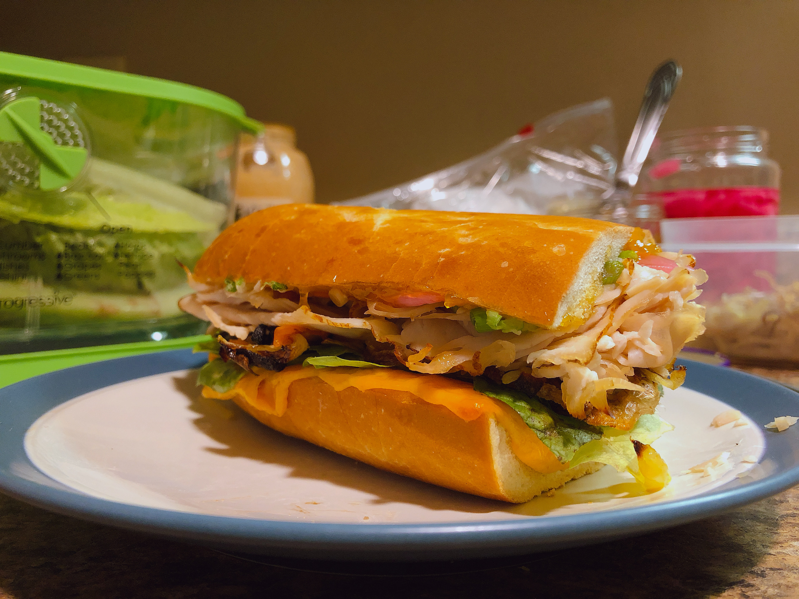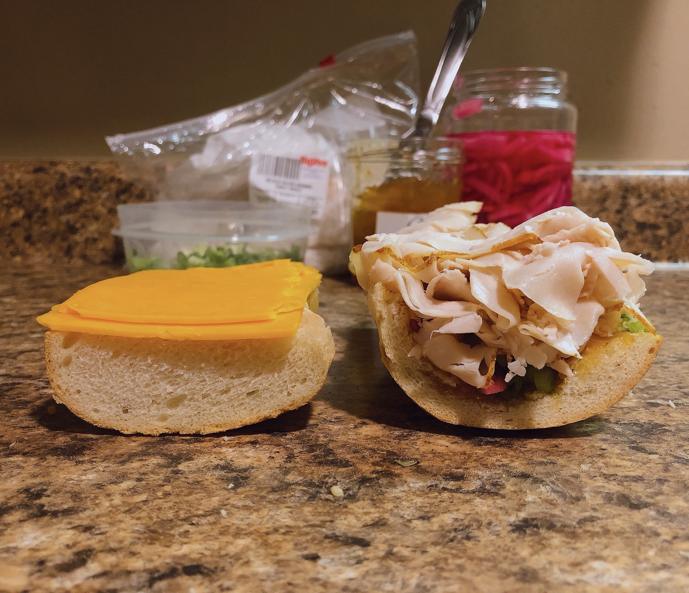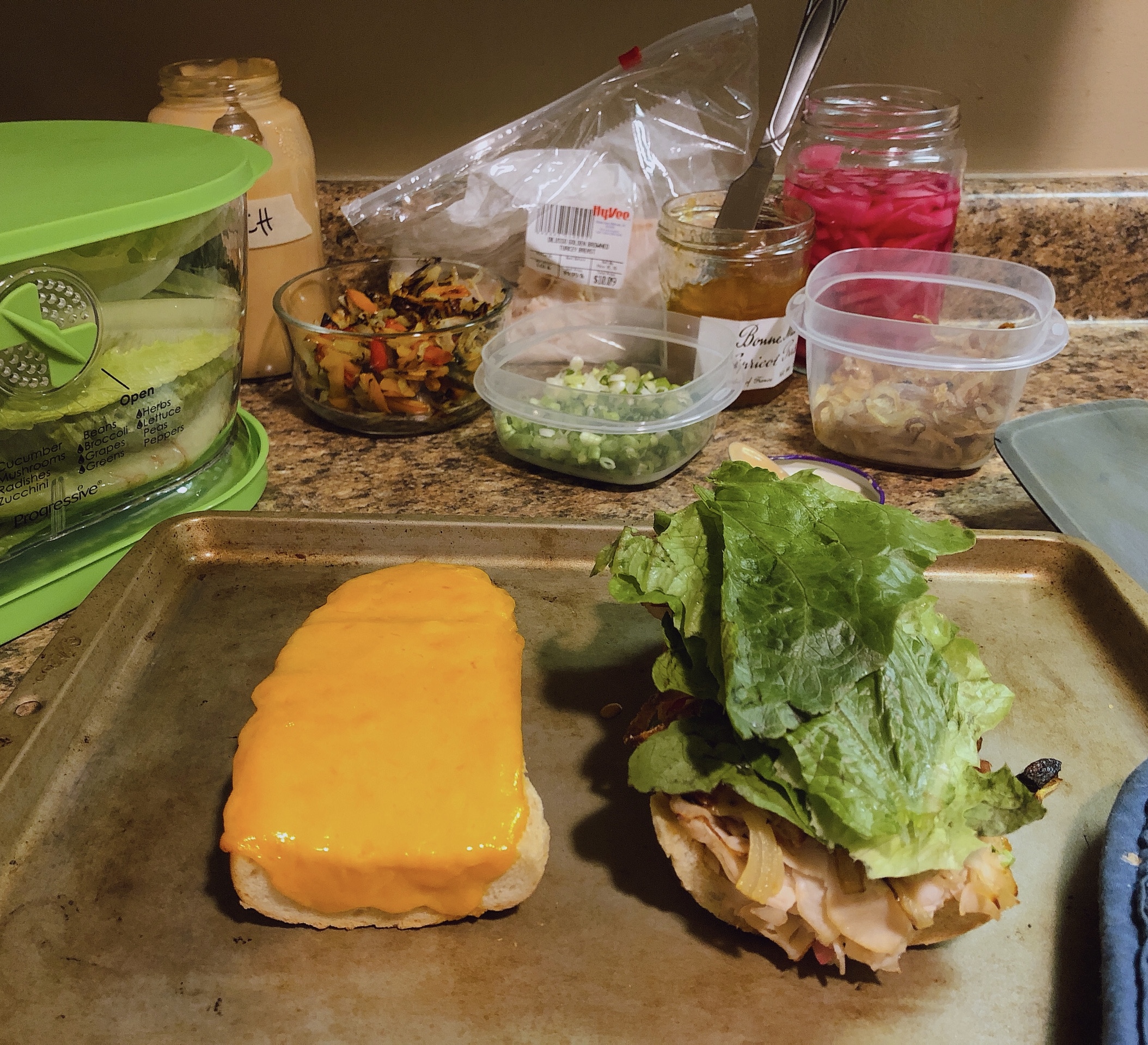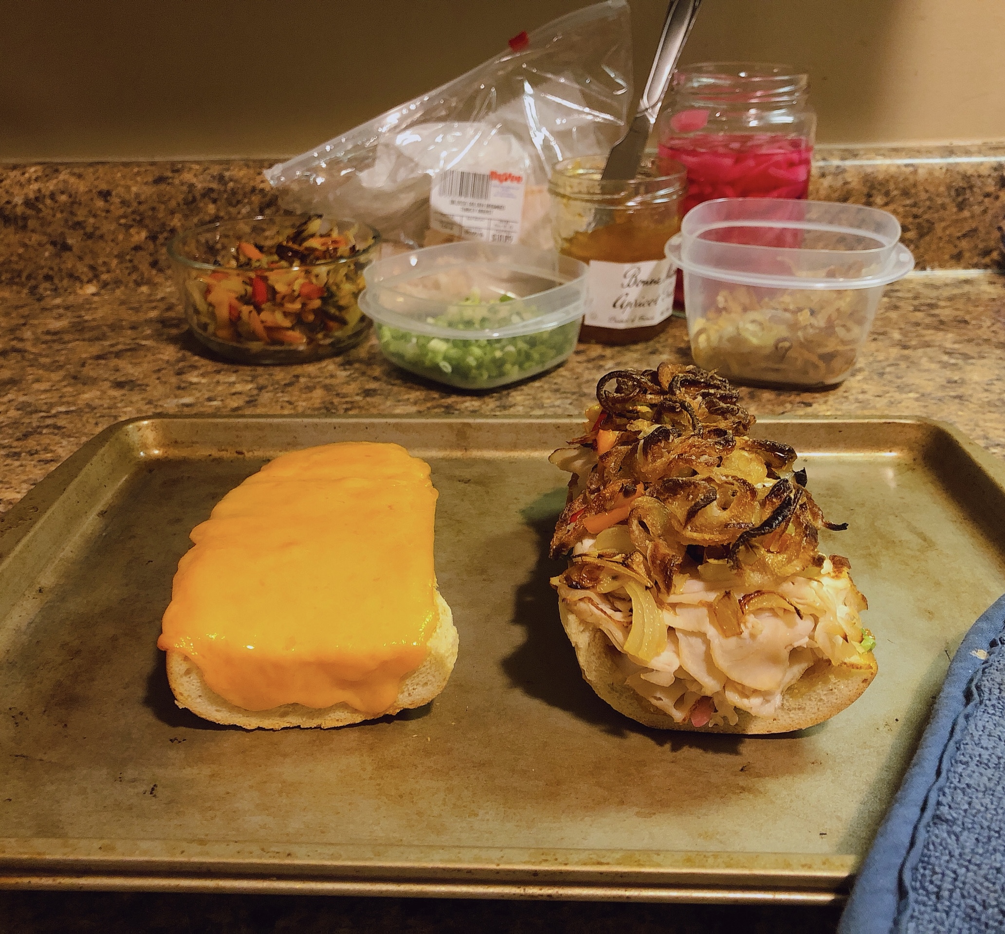 - Assembly, part one: 1) Sprinkle on the scallions, pressing them into the preserves; make sure to get them on the “walls” of the bread (if you scooped it out) and edges. 2) Add the pickled red onions, again making sure to layer on the bottom and walls. 3) Layer in the turkey; there will be enough that you can start squashing the bread to flatten it out without spilling the previous ingredients or making too much of mess. 4) Spread on the roasted onions & sweet peppers; these are pretty mild, so go crazy. 5) Add the fried shallots; marvel at your beautiful creation–but wait, there’s more!