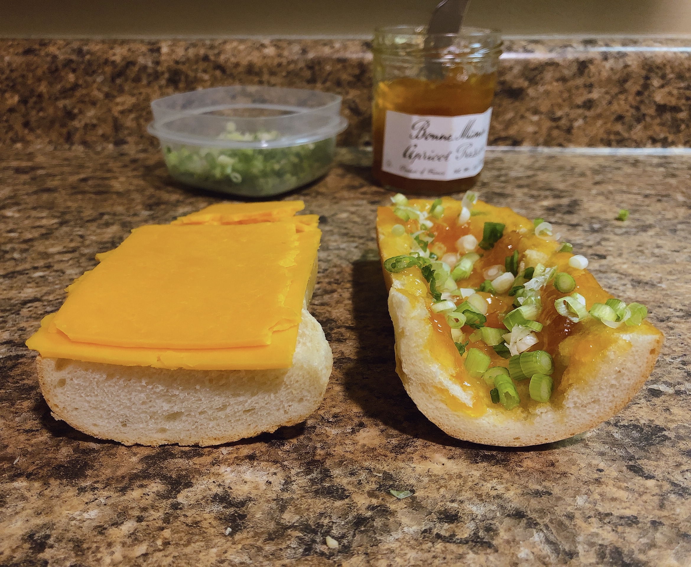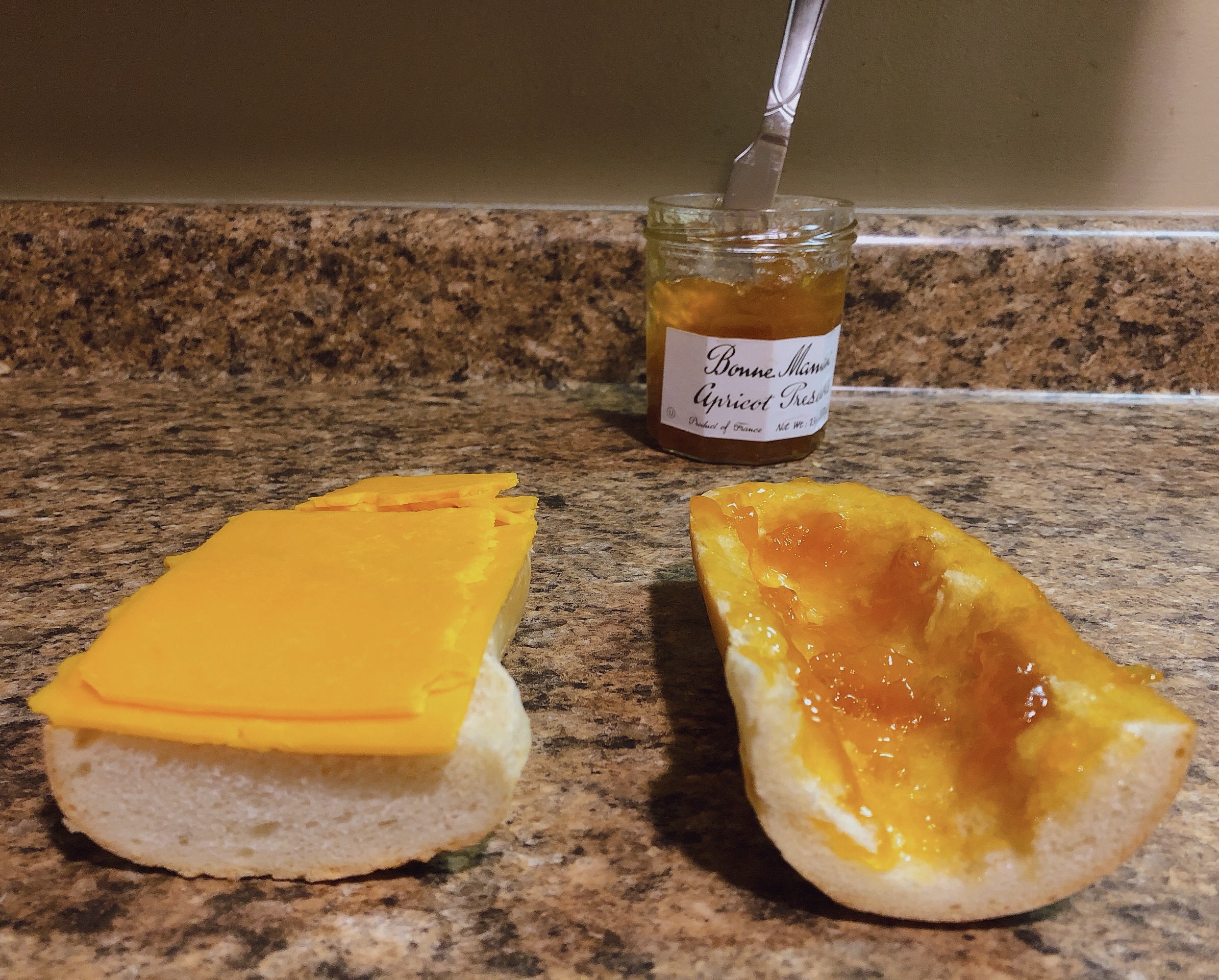 - Lay the cheese out on the bottom half of the loaf. Spread apricot preserves on the top half; don’t make the layer too thick, but the whole surface should be covered.