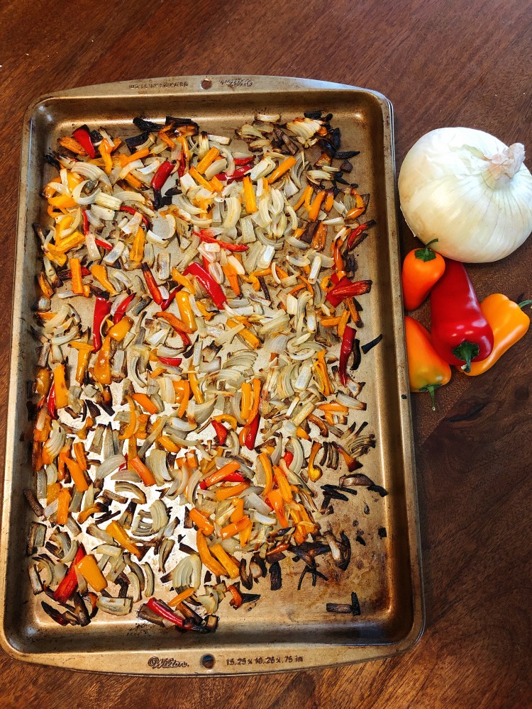 Do not use too much oil. The the point of the oil is to add a hint of flavor and to keep the onions and peppers from sticking to the baking sheet. Too much oil will keep them from crisping. You want some regular looking onions/peppers, some with crisped edges, and a few that are at least 50% char. (This is also why you shouldn’t pause to stir them at all while they’re roasting.) Variety is the spice of onions & peppers.